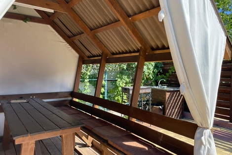 Уютная деревянная стационарная беседка под собственным навесом.
