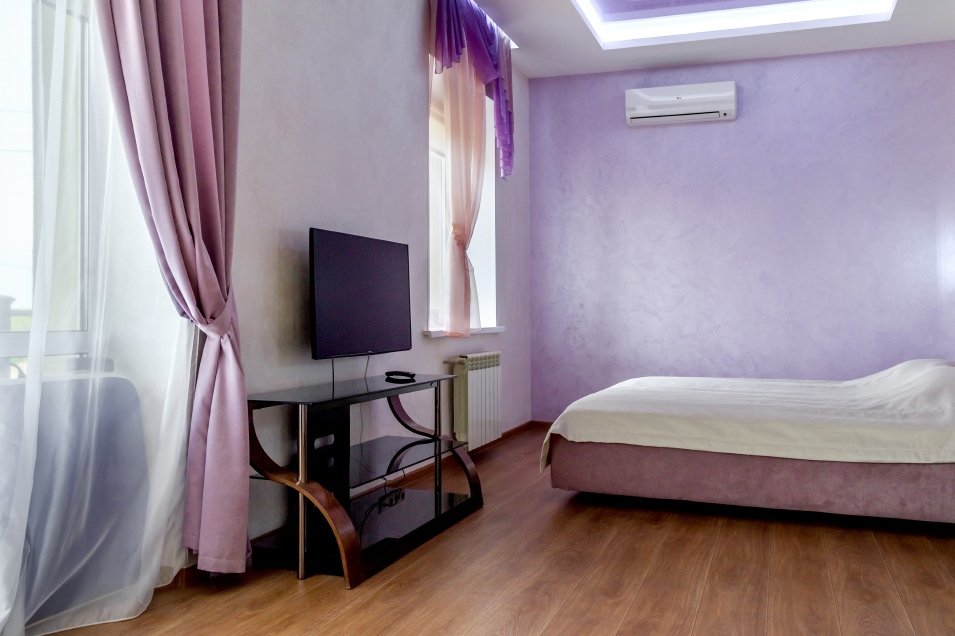 В номере присутствует 1 двуспальная кровать (160х200 см), прикроватные тумбы, сплит-система, холодильник, телевизор (smartTV), обеденный стол, электрический чайник.