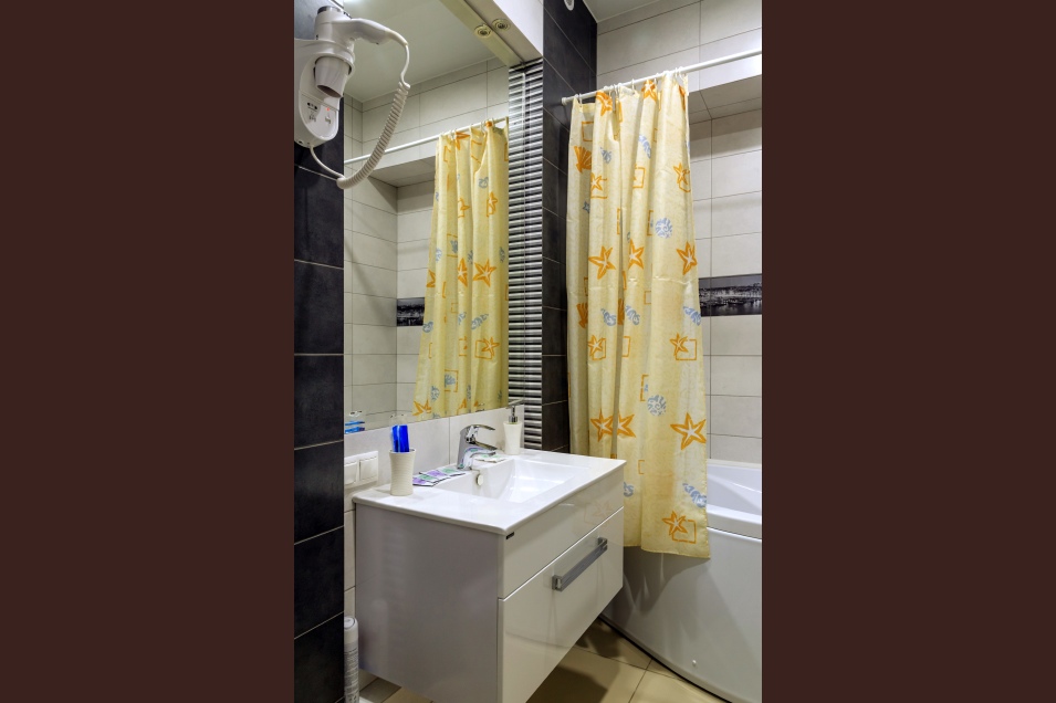 Имеется полноценная ванная комната, в ней присутствует ванная, туалет, раковина с зеркалом и электрический фен для волос, сушилка для одежды.