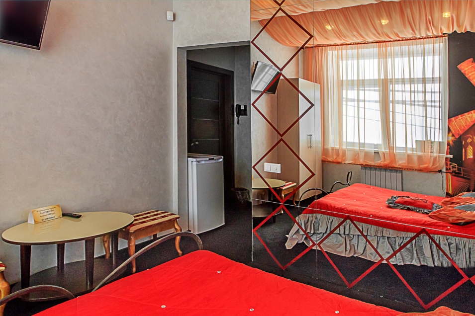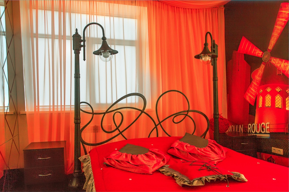 Номер выполнен в стиле известной достопримечательности Французской столицы - "Moulin Rouge". Кровать состоит из кованых элементов, оформлена фонарями-светильниками, а мягкое и теплое покрытие на полу не оставит равнодушным никого.