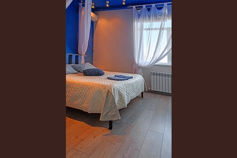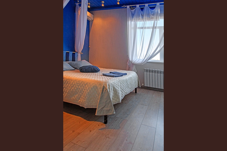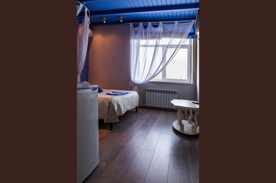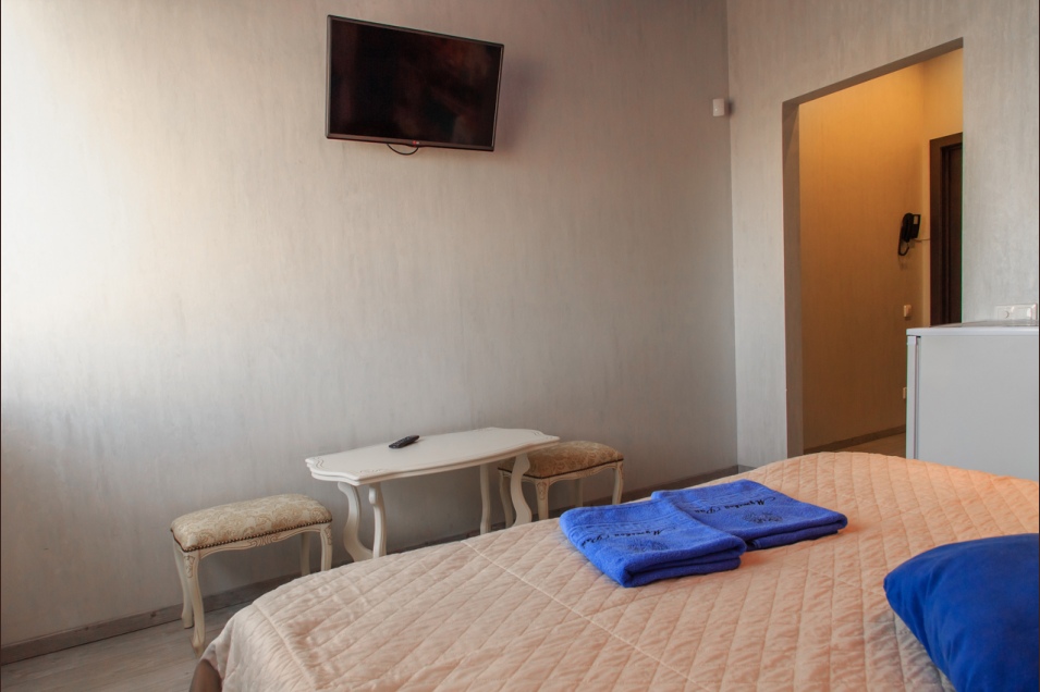 В номере присутствует 1 большая двуспальная кровать, сплит-система, холодильник, телевизор (smartTV), чайный столик и стулья, электрический чайник, набор бокалов.