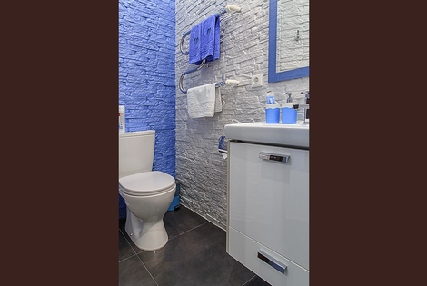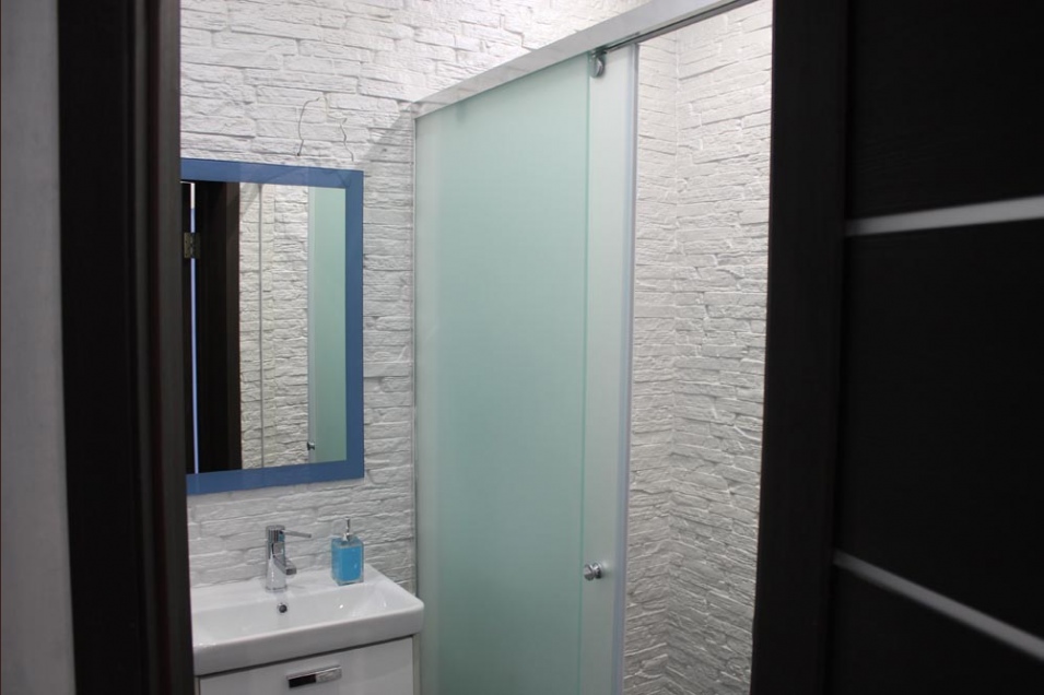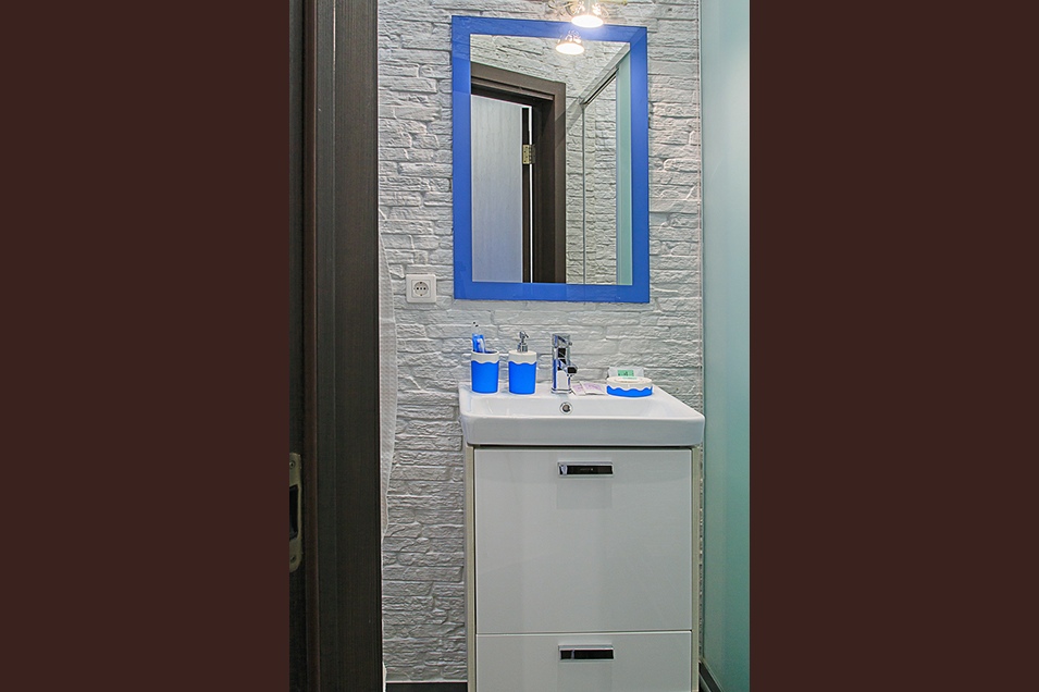 Имеется полноценная ванная комната, в ней присутствует душ, туалет, раковина с зеркалом и электрический фен для волос, сушилка для одежды.