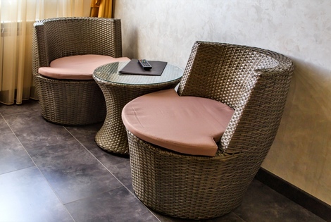 В номере присутствует 1 большая двуспальная кровать и диван , сплит-система, холодильник, телевизор (smartTV), шкаф для одежды и багажа, чайный столик и стулья, электрический чайник, набор бокалов.