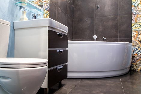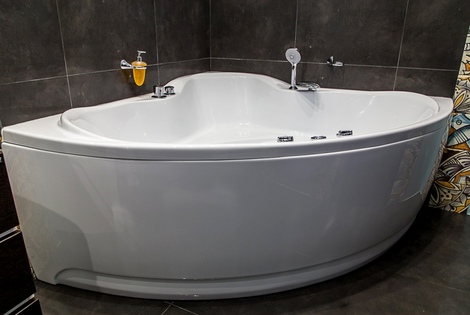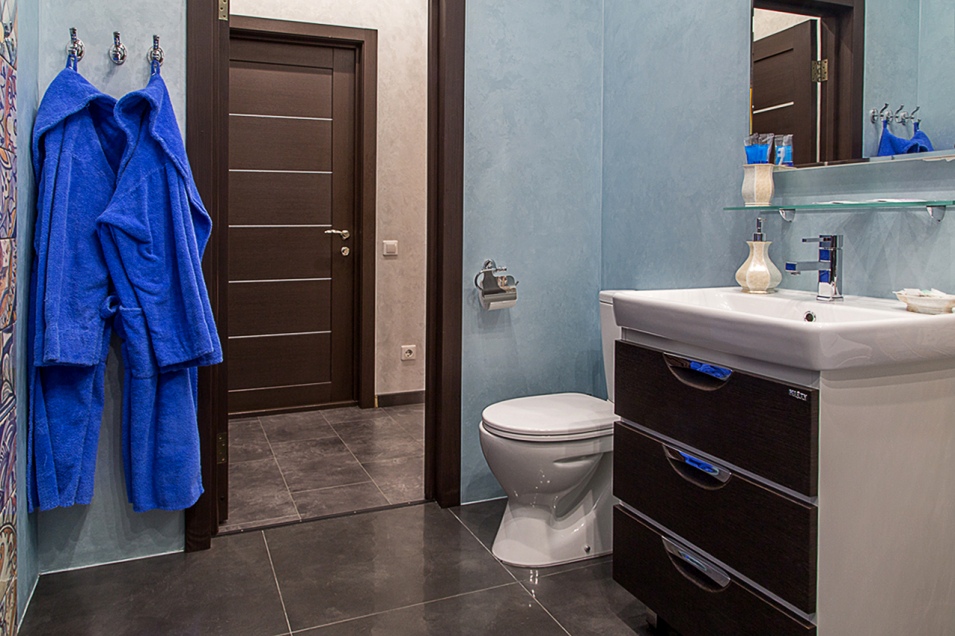 Имеется полноценная ванная комната, в ней присутствует ванна-джакузи, туалет, раковина с зеркалом и электрический фен для волос.