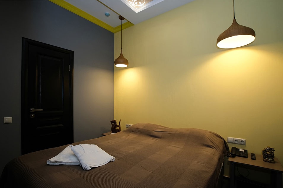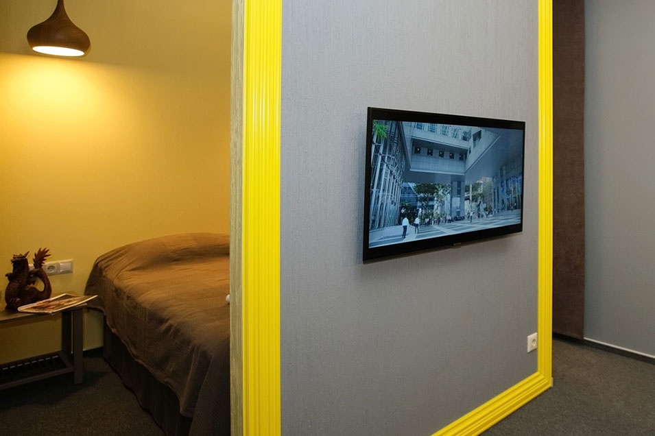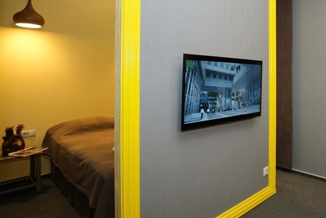 В номере присутствует 1 большая двуспальная кровать, сплит-система, холодильник, телевизор (smartTV), чайный столик и стулья, электрический чайник, набор бокалов.