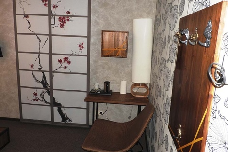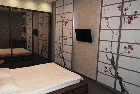 В номере присутствует 1 большая двуспальная кровать, сплит-система, холодильник, телевизор (smartTV), чайный столик и стулья, электрический чайник, набор бокалов.